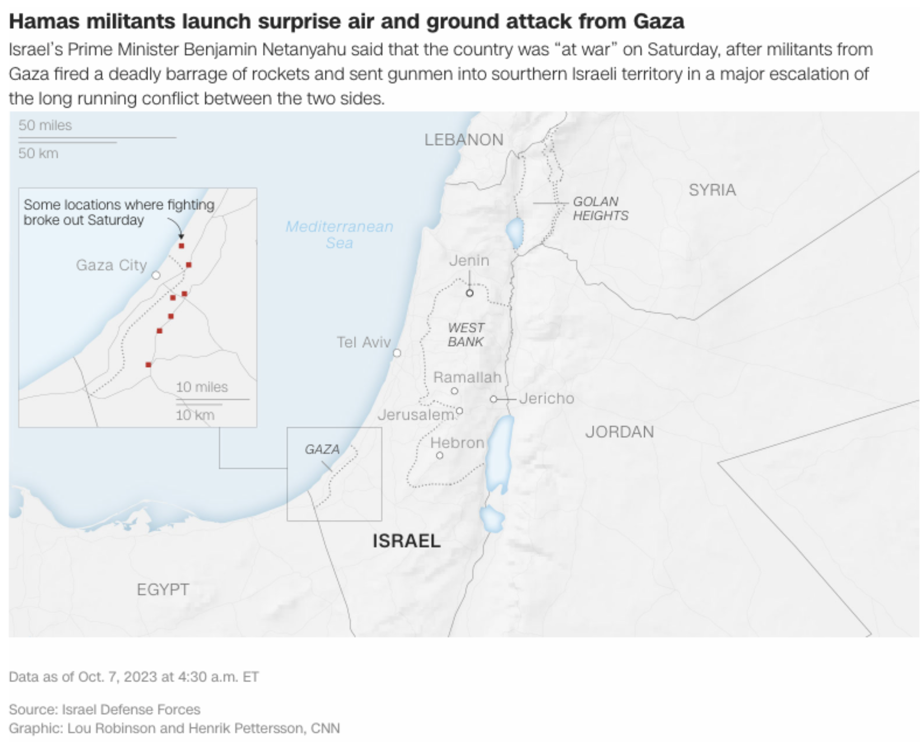 En las primeras horas de este sábado 7 de octubre, fuerzas de la organización palestina Hamás, declarada como yihadista, nacionalista e islamista, realizó sin previo aviso un ataque contra Israel, en la denominada “Operación tormenta Al-Aqsa”, desde posiciones en la franja de Gaza, afectando principalmente la ciudad de Ashkelon, situada a 56 km al sur de Tel Aviv y 73 km al sudoeste de Jerusalén y a las ciudades de Tel Aviv, Jerusalén y Sderot, causando a lo menos 100 muertos y centenares de heridos, en lo que ha sido calificado como el ataque más mortífero contra Israel desde la guerra entre Israel y Hamás en 2021 con un resultado de 230 palestinos y 13 israelíes, muertos.