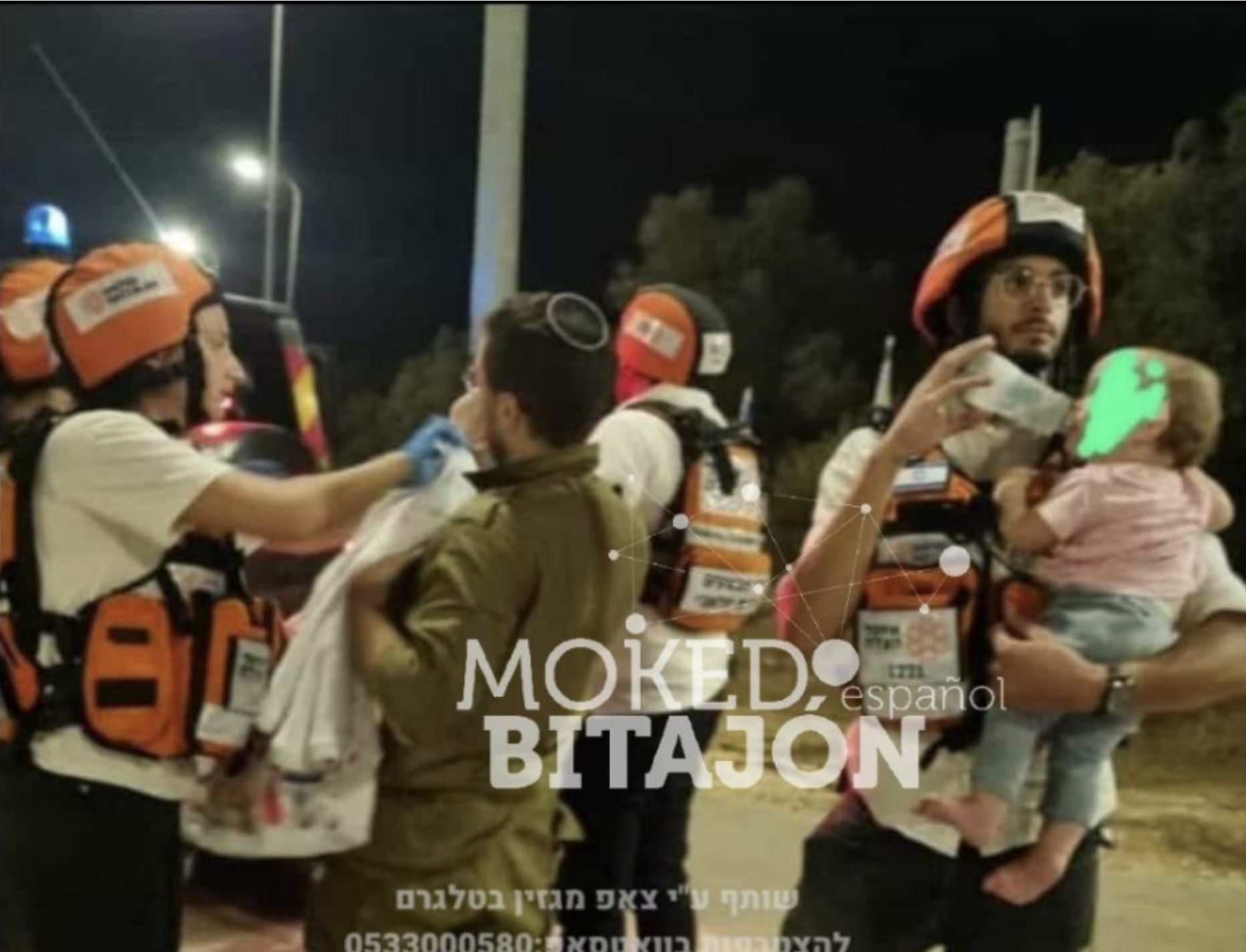 Fuente: Moked Bitajon. Voluntarios de la Unión de Rescate Ultraortodoxa que llegaron a uno de las localidades atacadas por los terroristas los cuales llevaron a cabo masacres en el lugar. Los voluntarios de emergencias encontraron bebés hambrientos en hogares sin sus padres, que fueron masacrados, y empezaron a alimentarles y cuidarles.