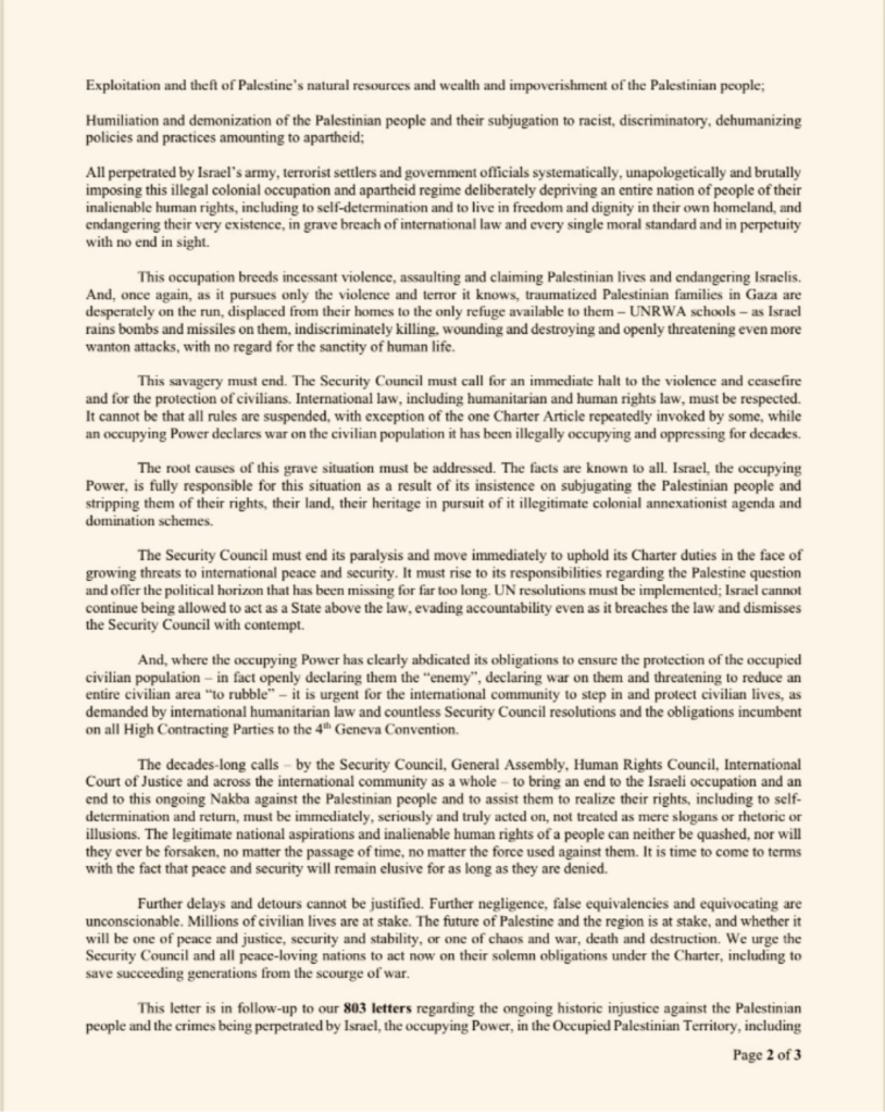 El Embajador ante las Naciones Unidas del Estado de Palestina, remitió el día de ayer una nota diplomática sobre la guerra que ha declarado Israel, urgiendo al Consejo de Seguridad a actuar ante la agresión histórica que ha sufrido Palestina, que amenaza con la desestabilización de toda la región, la cual se adjunta a continuación: